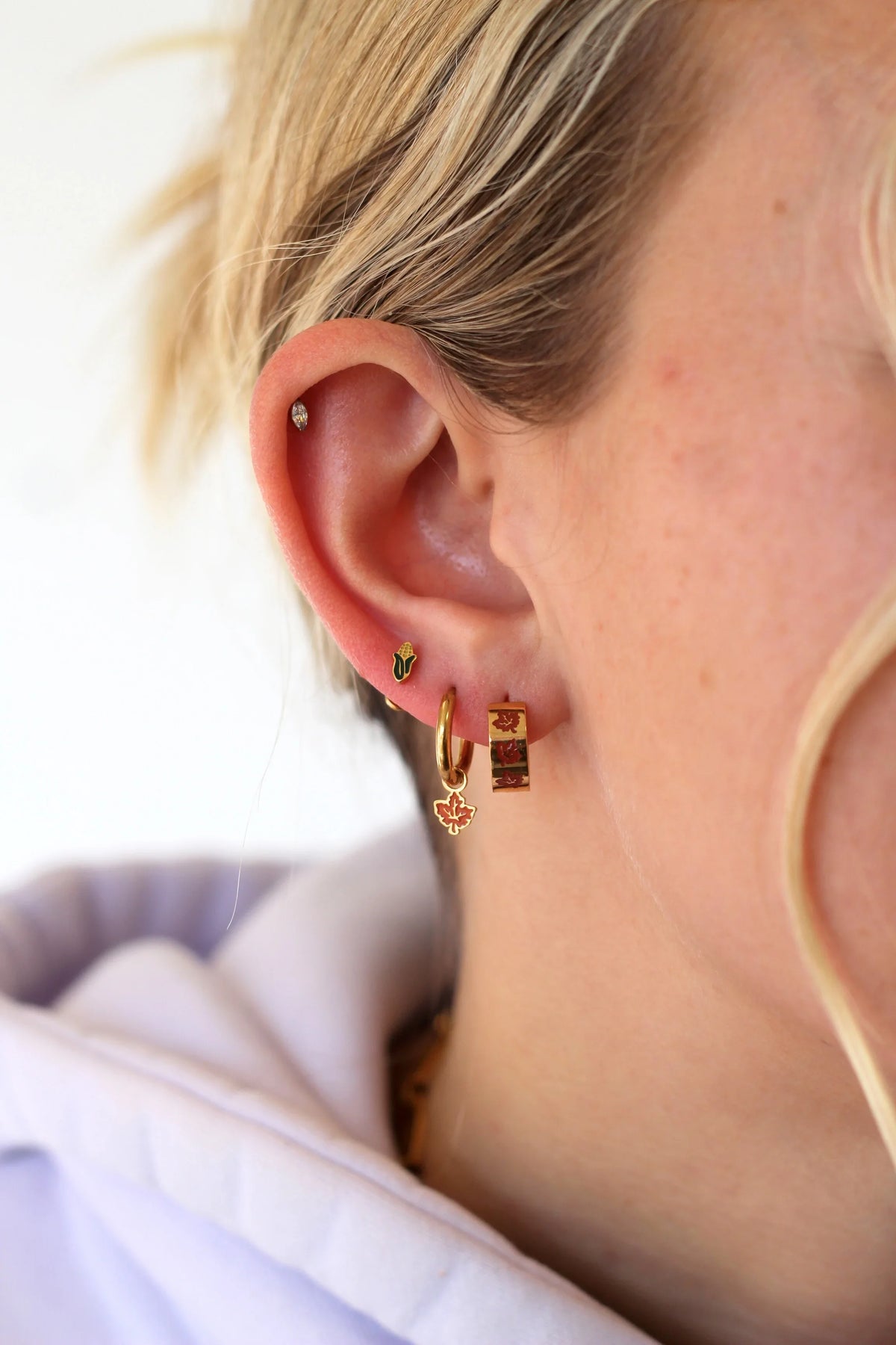 Crisp leaves, cozy vibes. The Falling Leaves Enamel Titanium Huggie Hoops are a fall must-have, featuring a seasonal leaf design on lightweight, comfy implant-grade titanium.