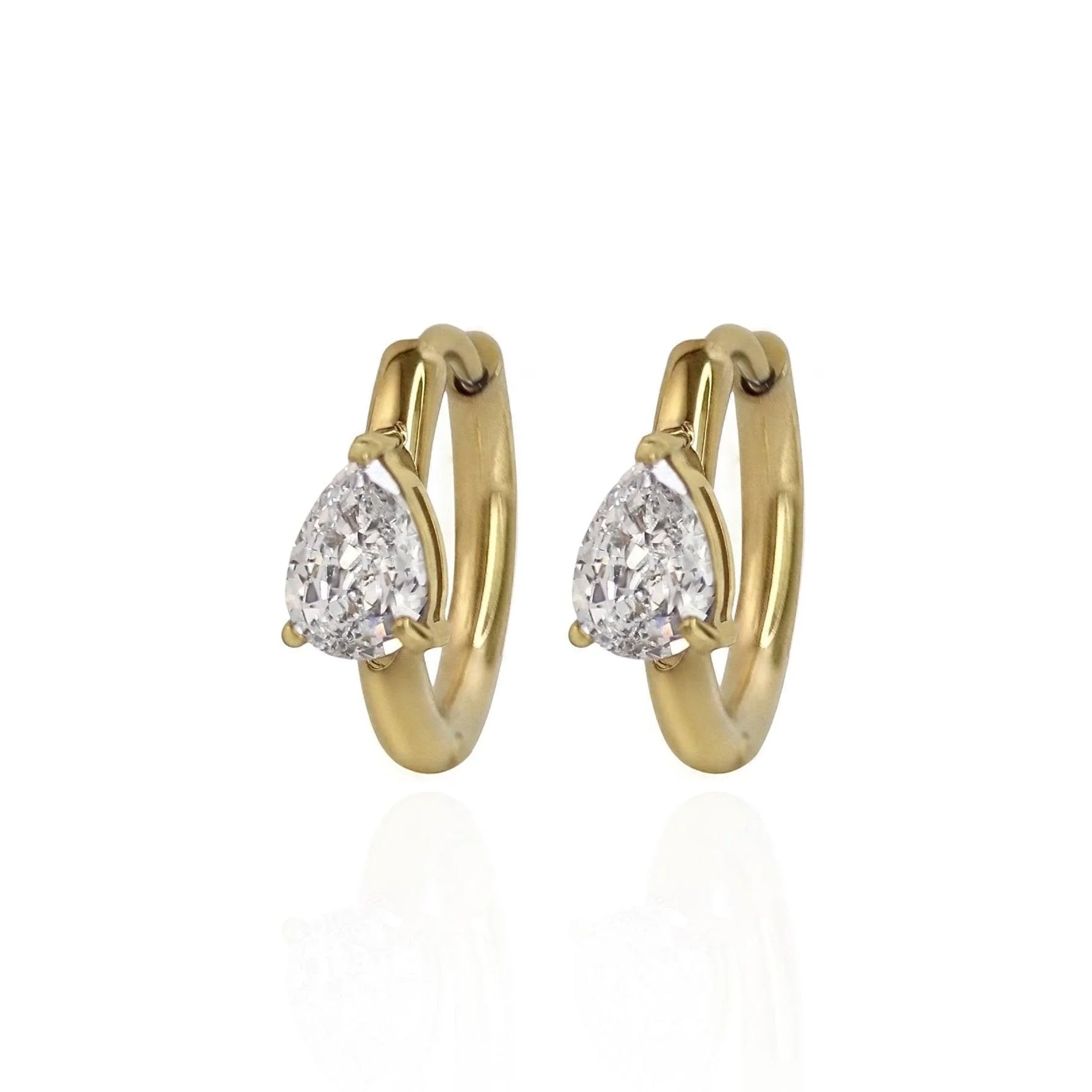 Partridge and tree not included. An elevated gold hoop, these dainty earrings feature a teardrop-shaped clear zirconia stone. They are stunning on their own or as part of a stack!