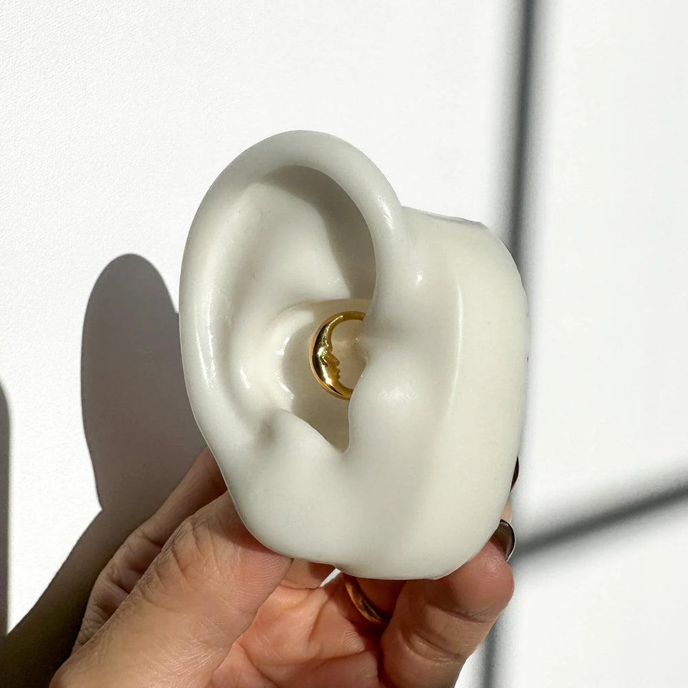 Maybe the most perfect daith hoop ever? The way that the sleepy crescent moon arches around your piercing is *chef's kiss*