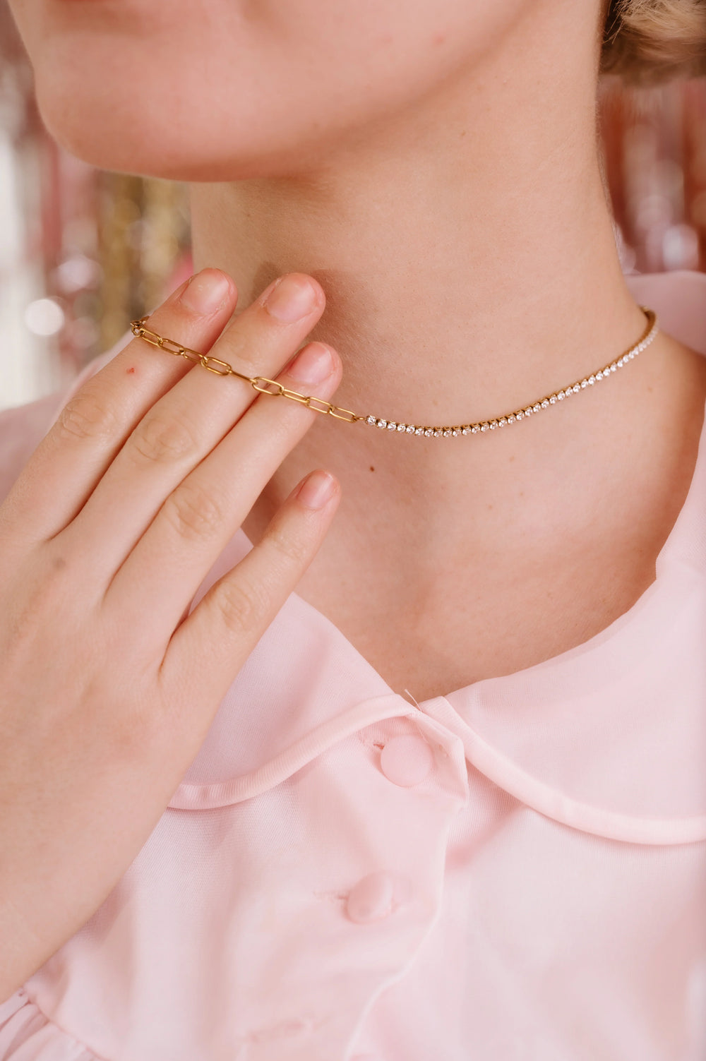 We took the classic tennis necklace and added a twist by mixing it with our salem paperclip necklace. This choker is sure to be a REPEAT STAPLE necklace in your wardrobe!