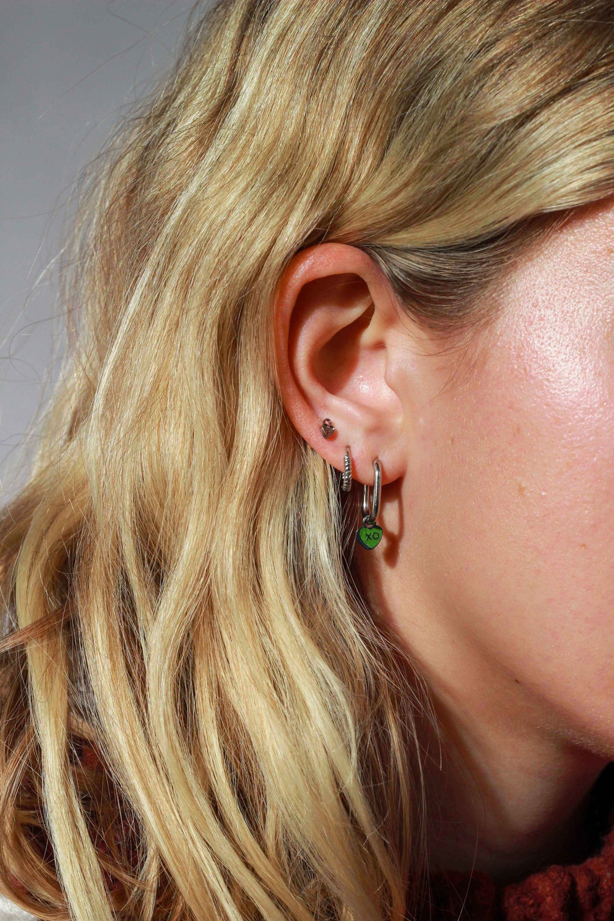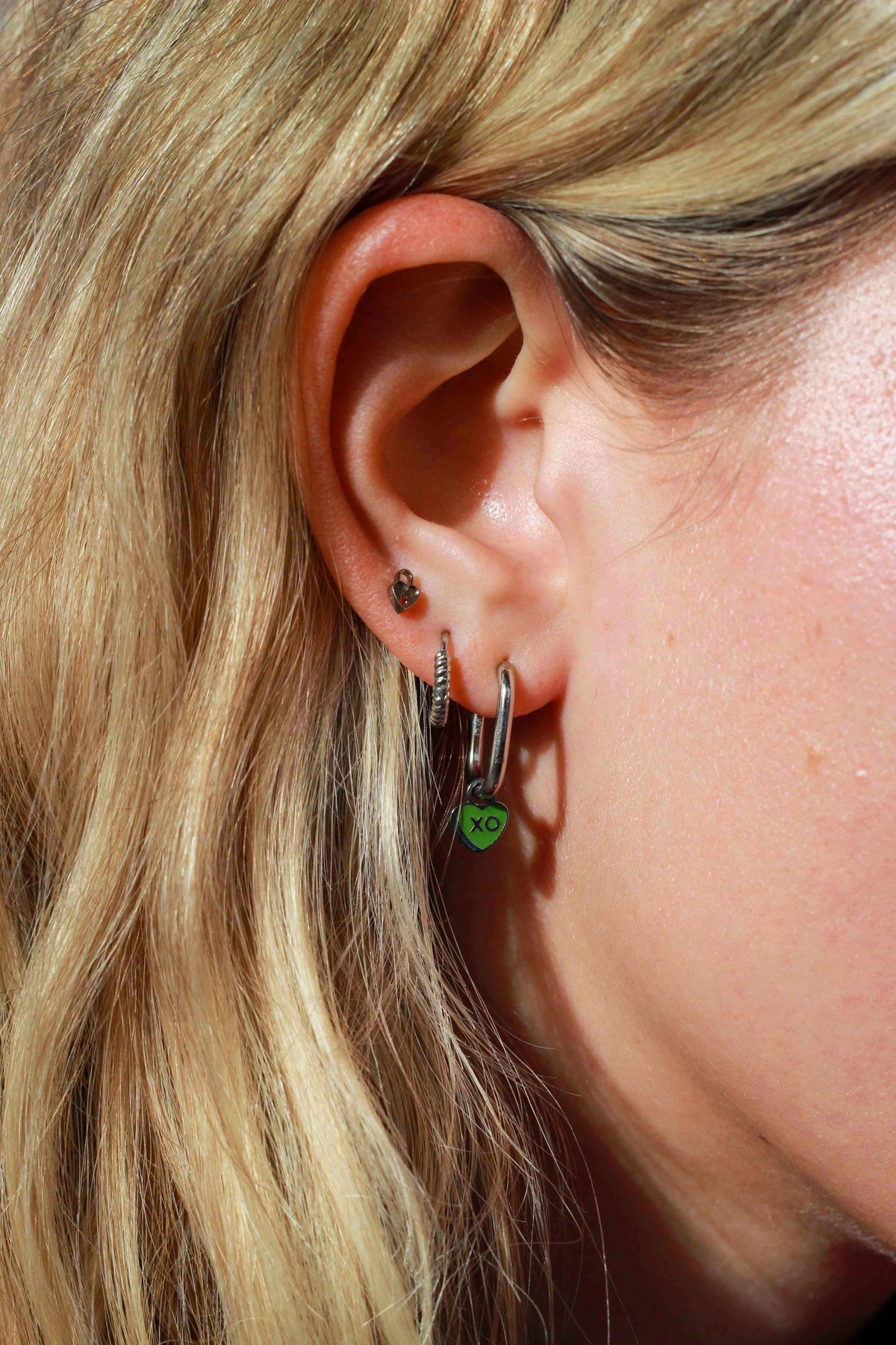 Straight out of your Valentine memories. Inspired by classic conversation hearts, the Candy Heart Hoop Charm features a glossy green enamel heart with a cute “XO” detail. Designed to add a little sweetness to your hoops, it’s a fun reminder that love is in the details.